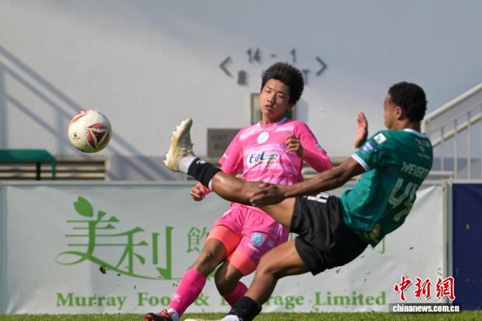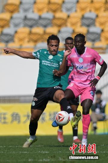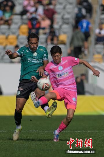 图为年夜埔队球员(绿衣)取规范流落队球员(粉白衣)拼抢。记者 旧永诺 摄
