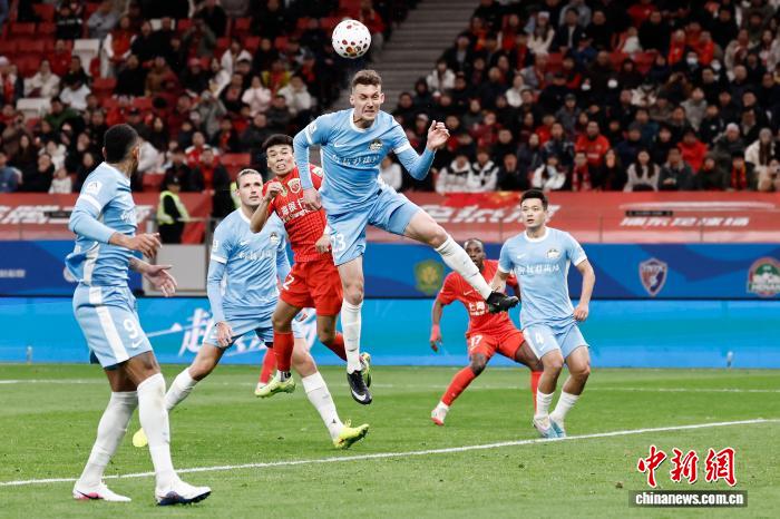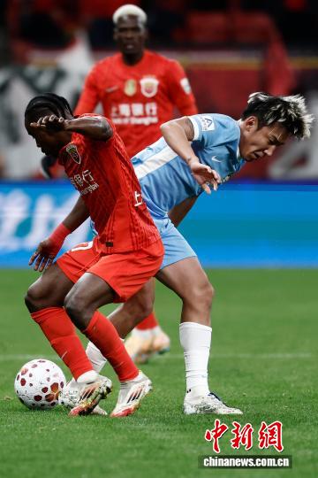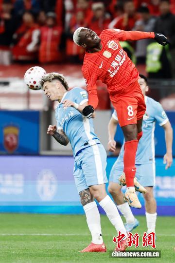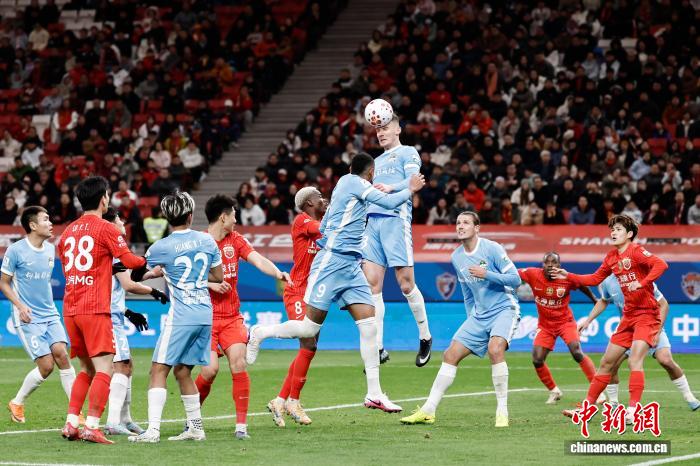 3月7日,河北脚球俱乐军队球员正在角逐中争球。当日,2026赛季华夏脚球超等联赛第1轮角逐中,上海海港队(白衣)主场1比2没有敌河北脚球俱乐军队。 中新社记者 殷坐勤 摄